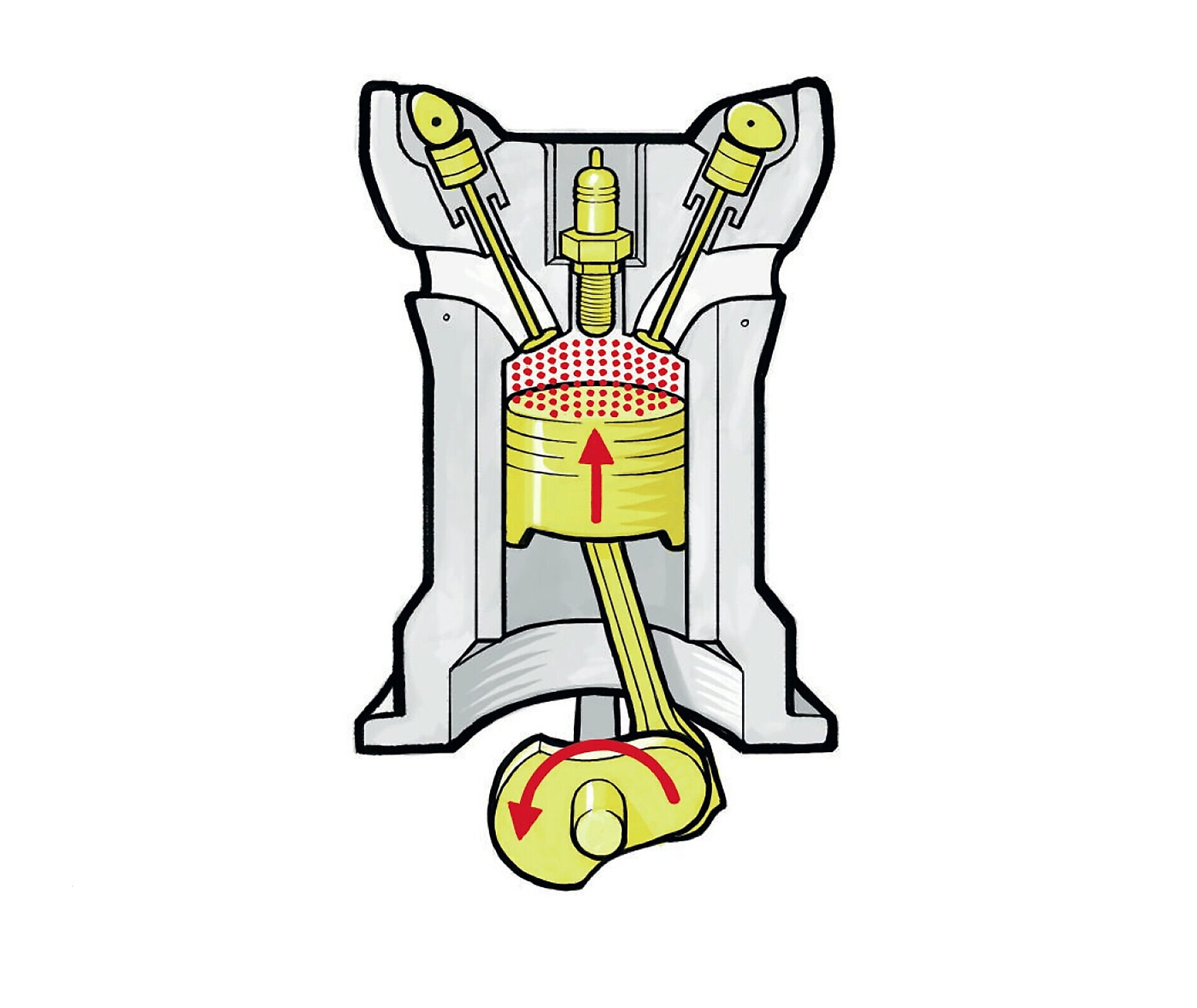 2. 现在两个气门都已关闭,活塞向上抬升,挤压油气混合物。